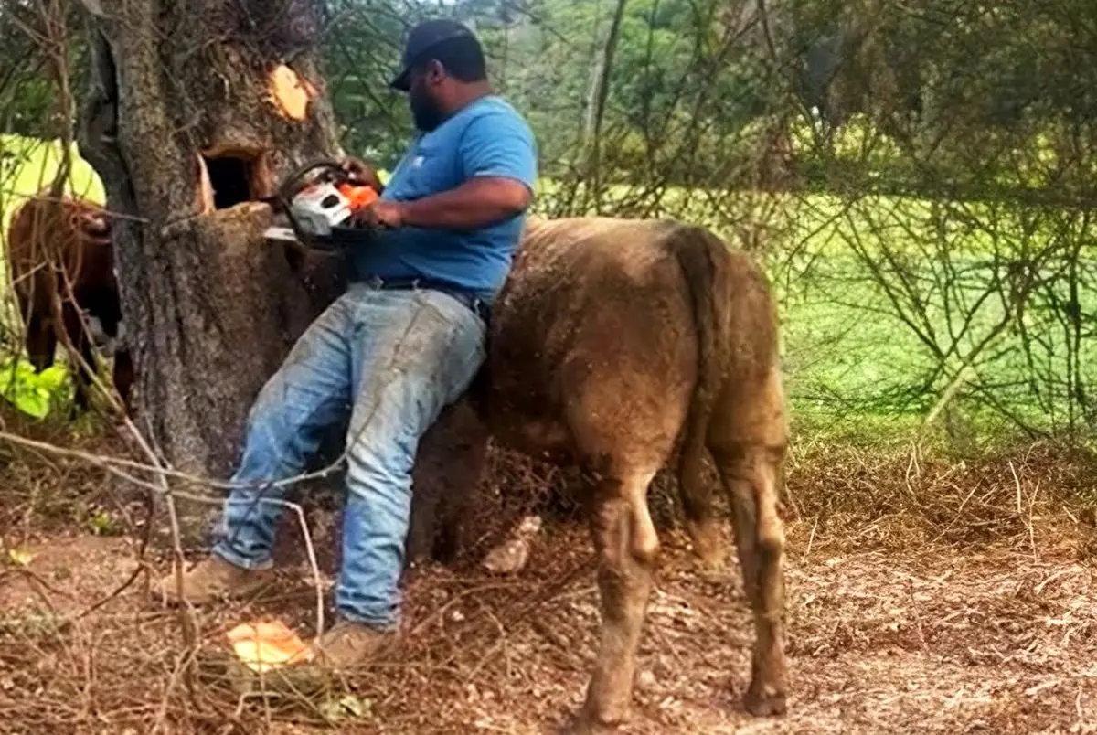 در این ویدیو می بینید که گوساله سرش تو درخت گیر می کنه و مرد با اره برقی تلاش می کنه تا نجاتش بده