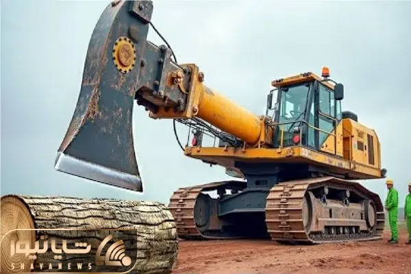 ابزارآلات غول پیکر؛ مهارت های اپراتور بیل مکانیکی در برش درخت بعد تبدیل شدن به تبر