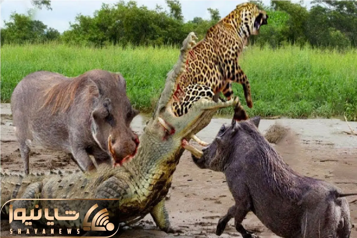 جذابیت حیات وحش؛ گراز وحشی برای نجات پلنگ از حمله تمساح به سرش لگد می زند