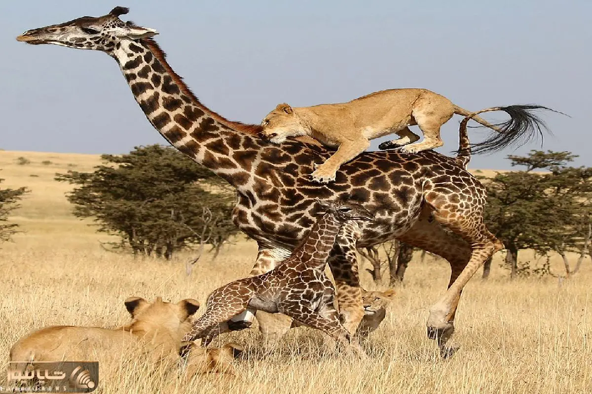 مستند حیات وحش؛ زرافه دراز ناز با چنگ و دندان از فرزندش مقابل شیر حراست میکند
