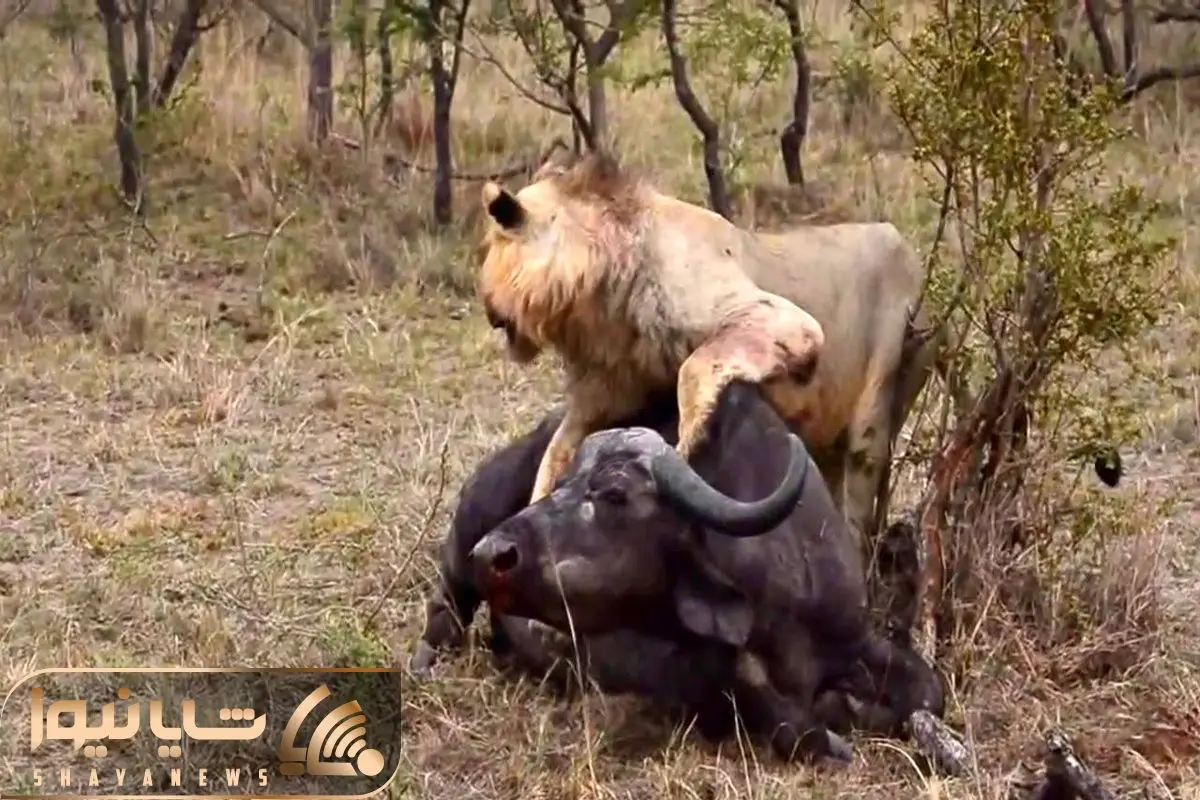 تلاش چند باره شیرها برای شکار بوفالو سرانجام موفق بود