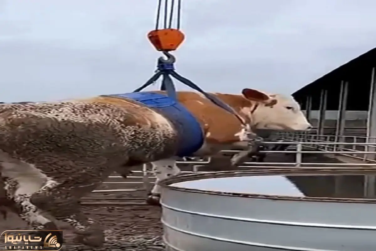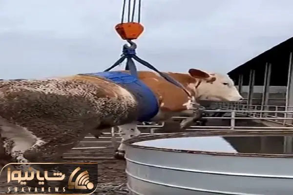 دامپروری نوین؛ گاو از همه جا بیخیر رو با بالابر میندازن تو بشکه آب هاج و واجه