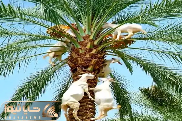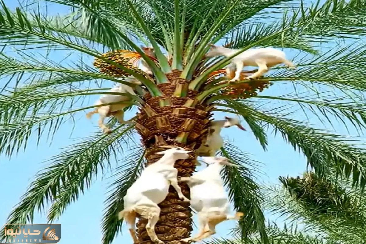 شاهد کلیپی جالب از بزهایی هستید که برای خوردن خرما از درخت نخل بالا رفتن.
