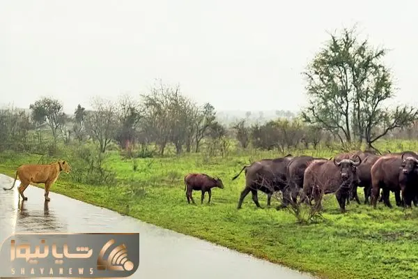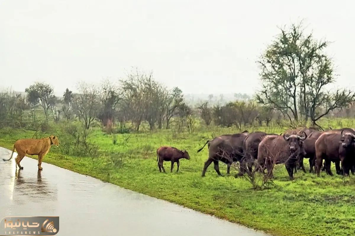 مستند حیات وحش؛ دیدبانی شیر وسط جاده برای گلچین کردن بوفالوی راحت الشکار