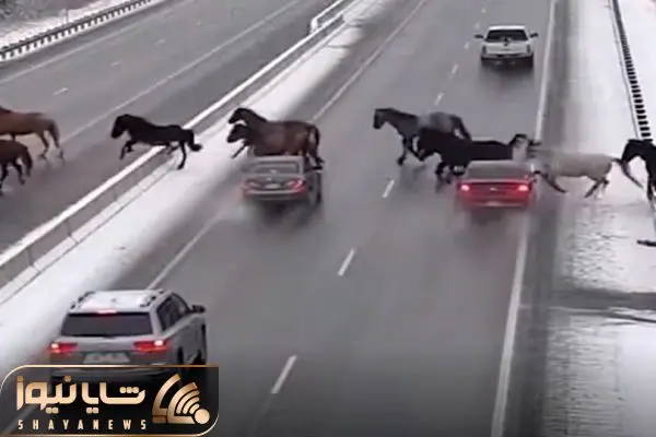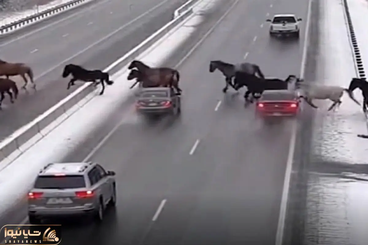 شاهد کلیپی از حمله ی اسب های وحشی به جاده و ماشین های در حال حرکت هستید.