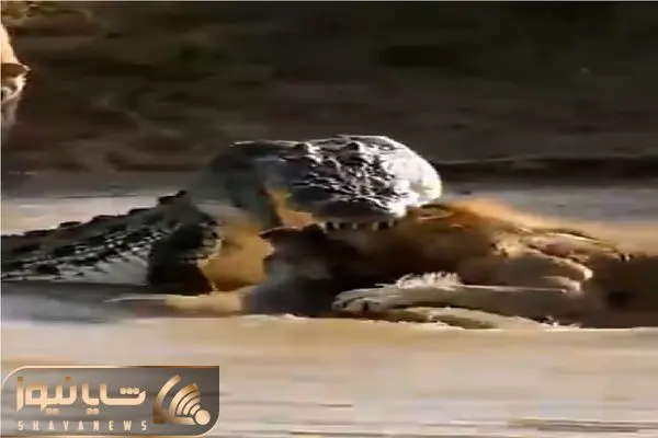 شاهد ویدیویی از نبرد تمساح و شیر برای خوردن گراز هستید.
