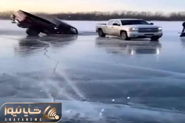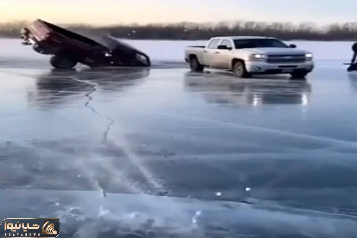 شاهد کلیپی از مردانی هستید که با ماشین هاشون رفتن رو یخ دریاچه وایسادن که خب تاوانشو میدن.