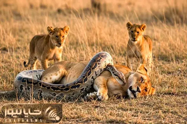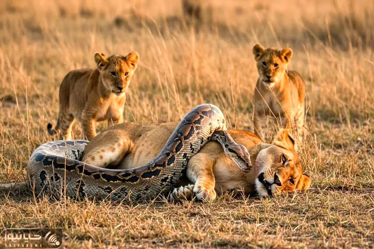 حیات وحش مصنوعی؛ شیر شجاع برای نجات مادرش از چنگ پیتون غول آسا کمک آورد