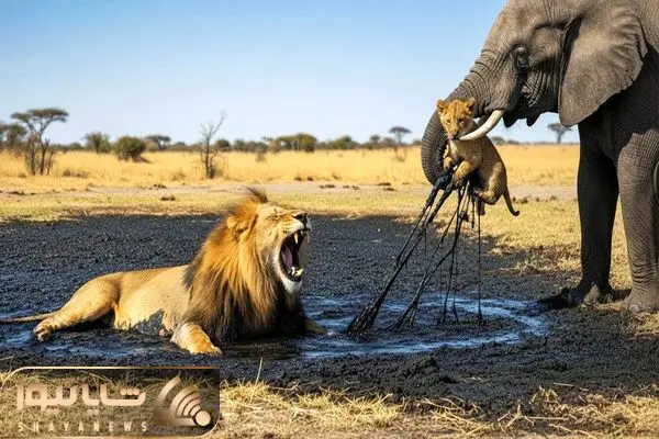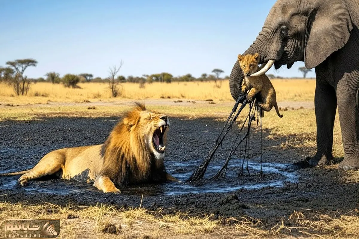 مستند حیات وحش؛ فیل مهربون ترسان لرزان شیر و بچه اش را از قیر مرگبار نجات داد