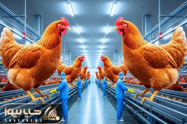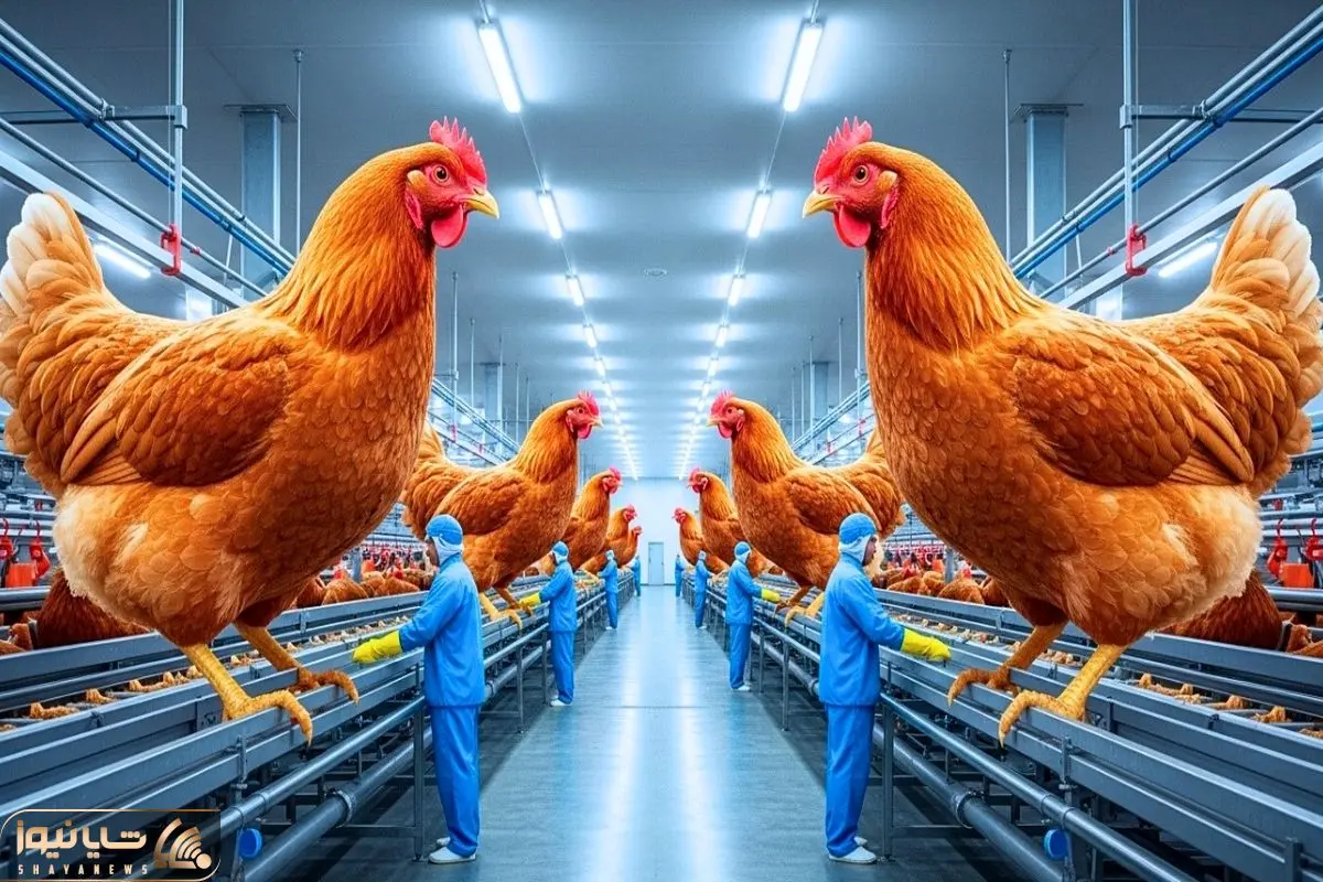 ویدیویی که یک کارخانه تولید و پرورش مرغ را نشان می دهد که از تخم تا پروار و چاق شدن مرغ ها کاملا تحت کنترل است