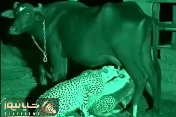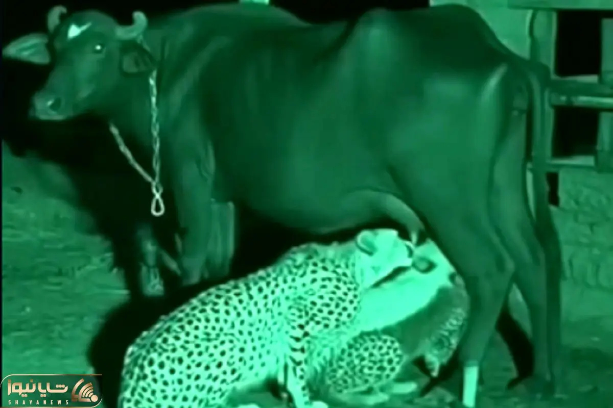 گاو آروم ایستاده کنارش یه یوزپلنگ دیده میشه، نه در حالت حمله، نه در حال تعقیب یوزپلنگ نزدیک میشه و شروع میکنه به شیر خوردن