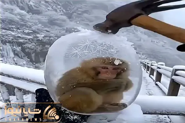 معماری طبیعت؛ دور بچه میمون از سرمای زیاد یخ بسته با چکش آزادش میکنن میزنه به چاک