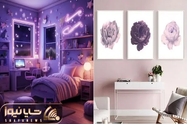 دیوار بنفش؛ رنگ بنفش برای تمام دیوارها ممکن است برای اتاق‌ های کوچک کمی سنگین به نظر برسد. بهتر است یک دیوار به رنگ بنفش باشد و باقی دیوارها رنگ‌ های روشن‌ تری داشته باشند.