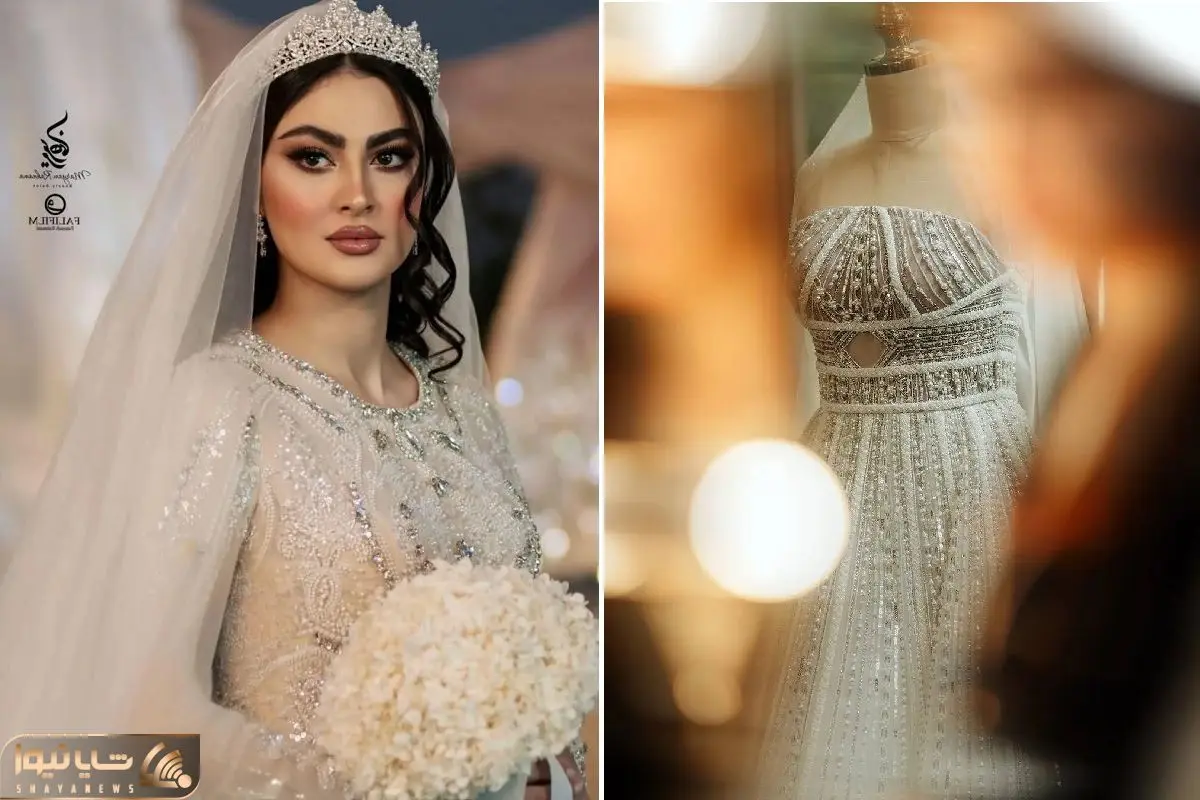 لباس عروس متین ستوده هم جذابیت های زیادی داشت. از بالا تا انتهای دنبالهی بلند لباس، نگیندوزیها و درخشش فراوان وجود داشت. این نوع طراحی بیشتر شبیه لباسهای فرشقرمزی هالیوود است؛ تمرکز از سادگی به نمایش و جلب نور منتقل شده و دنباله و نگینها نقش اصلی را در خلق جلوهی بصری ایفا میکنند. همچنین وزن و بافت این دو لباس متفاوت است؛ لباس ساده و بدون تزئین، سبکتر است و حرکتی نرمتر دارد، در حالی که لباس نگیندار سنگینتر و ساختارمندتر جلوه میکند و در عکس و ویدئوها بیشتر جلب توجه مینماید.