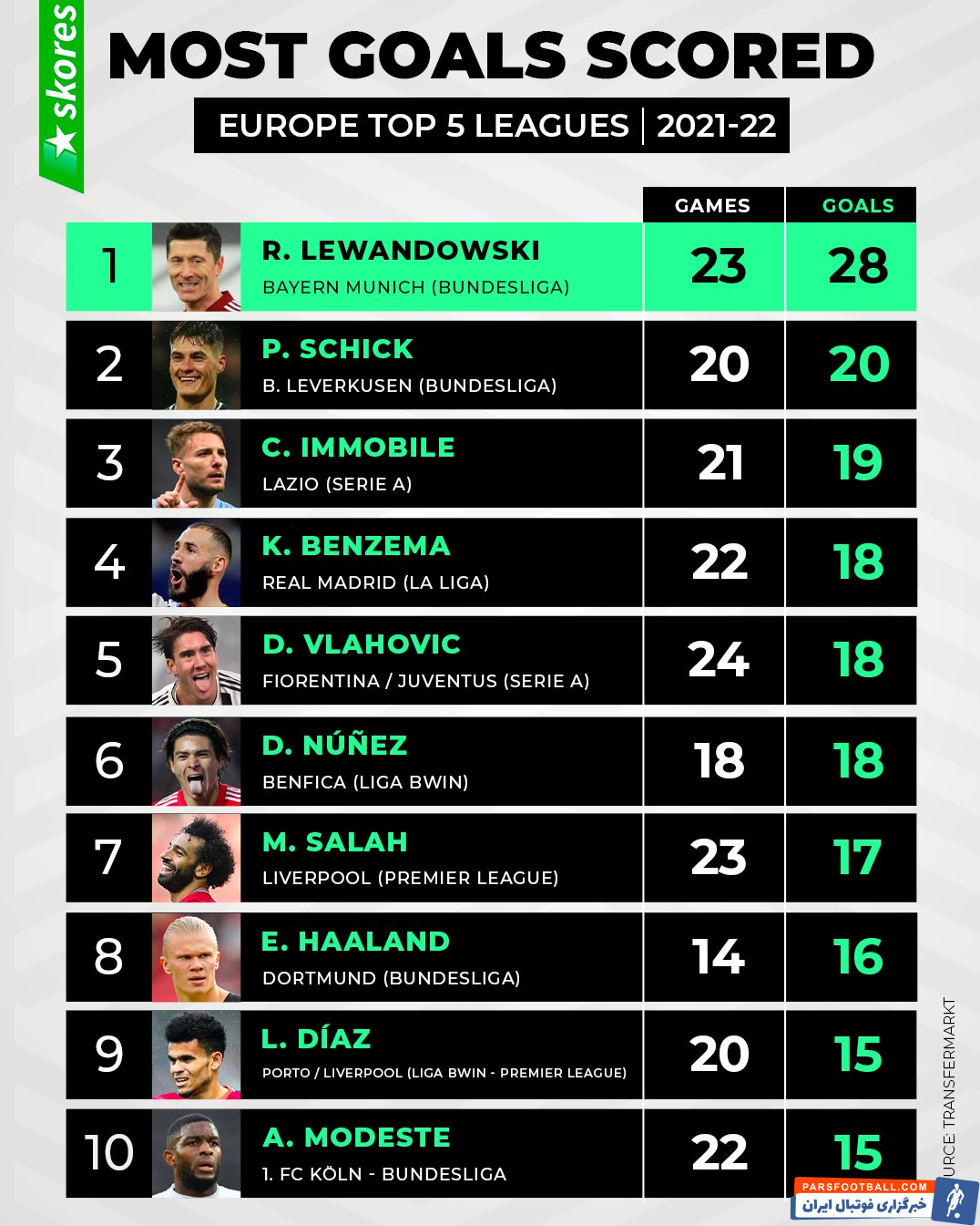 ستاره هایی نظیر لوئیس دیاز هم تیمی سابق مهدی طارمی در پورتو مهاجم فعلی لیورپول با ۱۵ گل در ۲۰ بازی نهم و مودست ستاره کلن با ۱۵ گل زده در ۲۲ بازی در رده دهم قرار دارند.